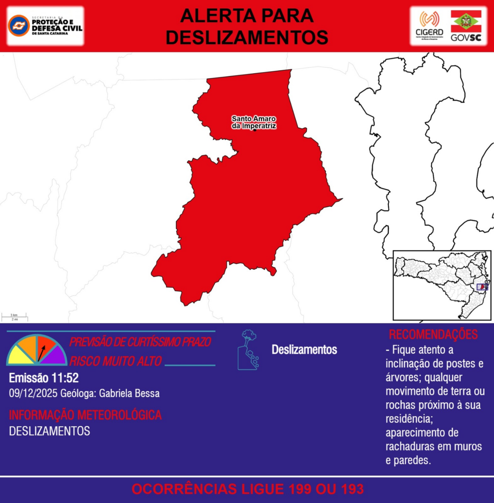 ALERTA – 09/12 11:52 – Risco de DESLIZAMENTOS para o município de Santo Amaro da Imperatriz.
