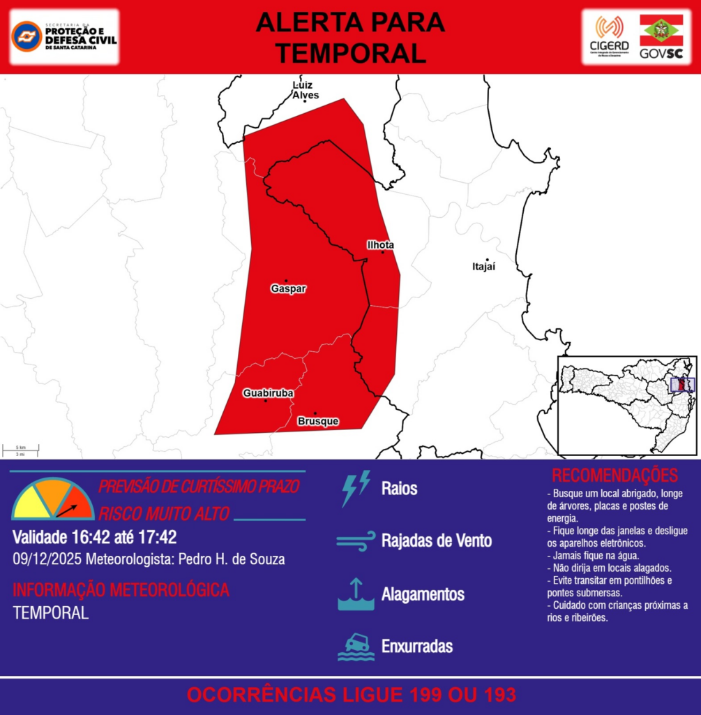 ALERTA – 09/12 16:42 – TEMPORAL com RAIOS, RAJADAS DE VENTO, ALAGAMENTOS e risco de ENXURRADAS para os municípios de Brusque, Gaspar, Guabiruba, Ilhota, Itajaí e Luiz Alves na próxima hora. Ocorrências ligue 199 ou 193.