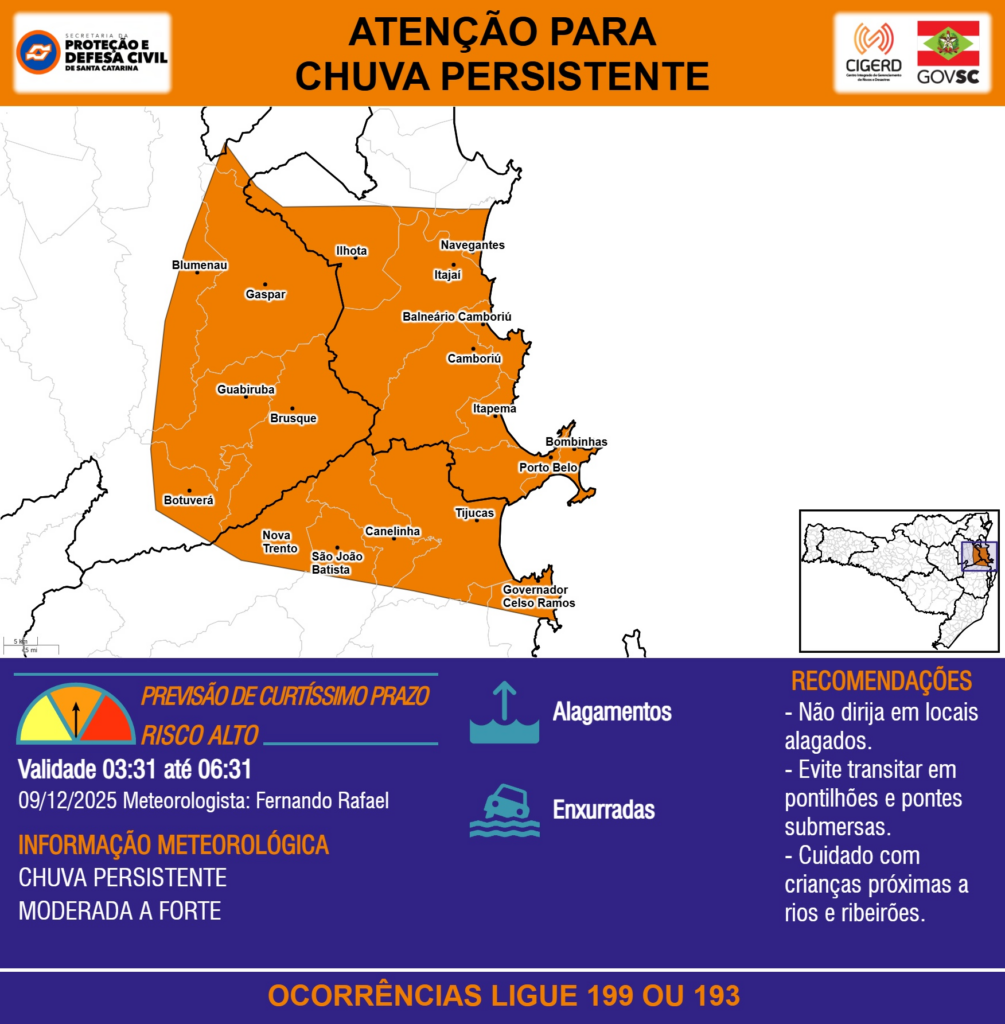 ATENÇÃO – 09/12 03:31 – CHUVA PERSISTENTE de intensidade moderada a forte com ALAGAMENTOS e risco de ENXURRADAS para os municípios de Balneário Camboriú, Biguaçu, Blumenau, Bombinhas, Botuverá, Brusque, Camboriú, Canelinha, Gaspar, Governador Celso Ramos, Guabiruba, Ilhota, Itajaí, Itapema, Navegantes, Nova Trento, Porto Belo, São João Batista e Tijucas nas próximas 3 horas. Ocorrências ligue 199 ou 193.