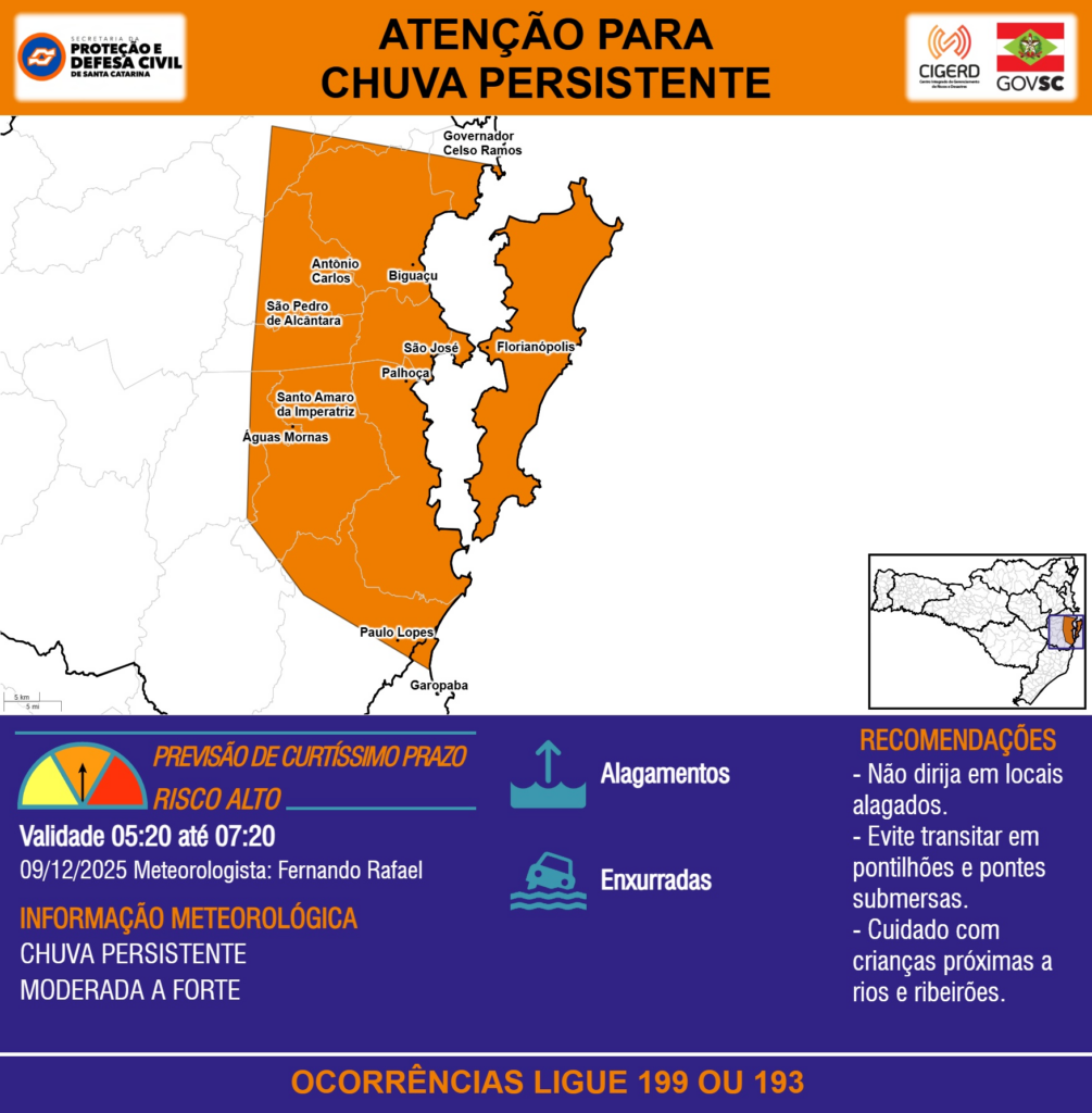 ATENÇÃO – 09/12 05:20 – CHUVA PERSISTENTE de intensidade moderada a forte com ALAGAMENTOS e risco de ENXURRADAS para os municípios de Antônio Carlos, Biguaçu, Florianópolis, Garopaba, Governador Celso Ramos, Palhoça, Paulo Lopes, Santo Amaro da Imperatriz, São José, São Pedro de Alcântara e Águas Mornas nas próximas 2 horas. Ocorrências ligue 199 ou 193.