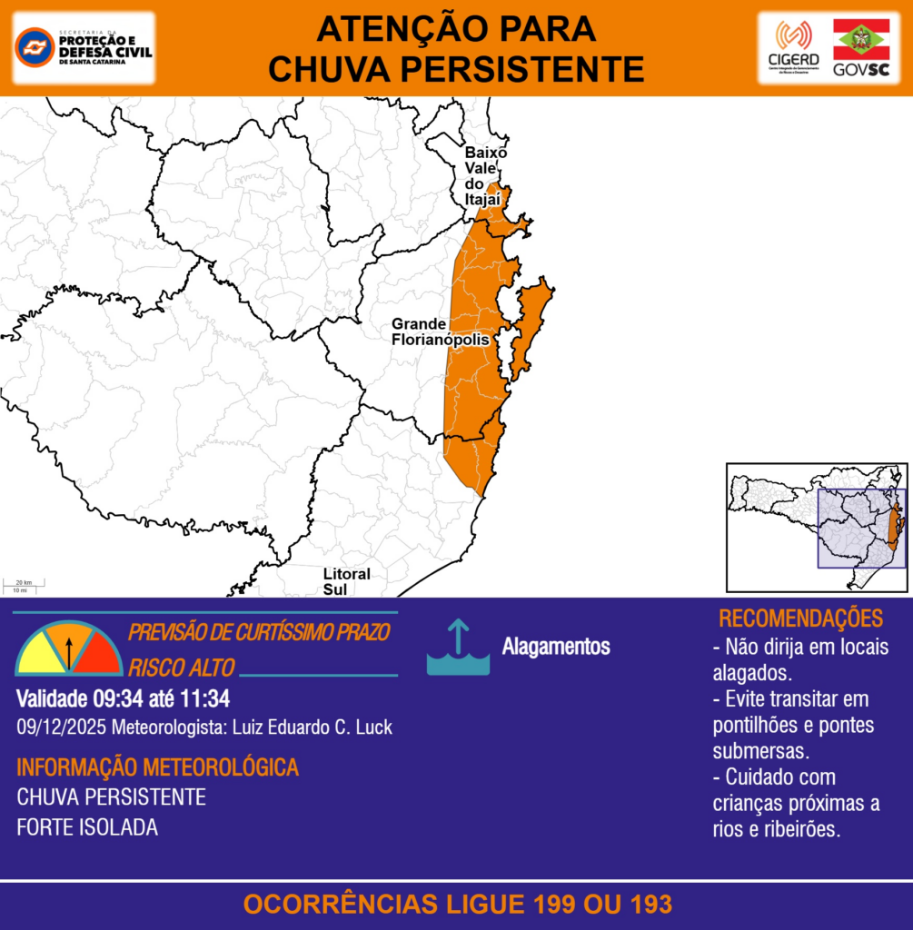 ATENÇÃO – 09/12 09:34 – CHUVA PERSISTENTE de intensidade forte isolada com ALAGAMENTOS para as regiões do Litoral Sul, Grande Florianópolis e Baixo Vale do Itajaí nas próximas 2 horas. Ocorrências ligue 199 ou 193.