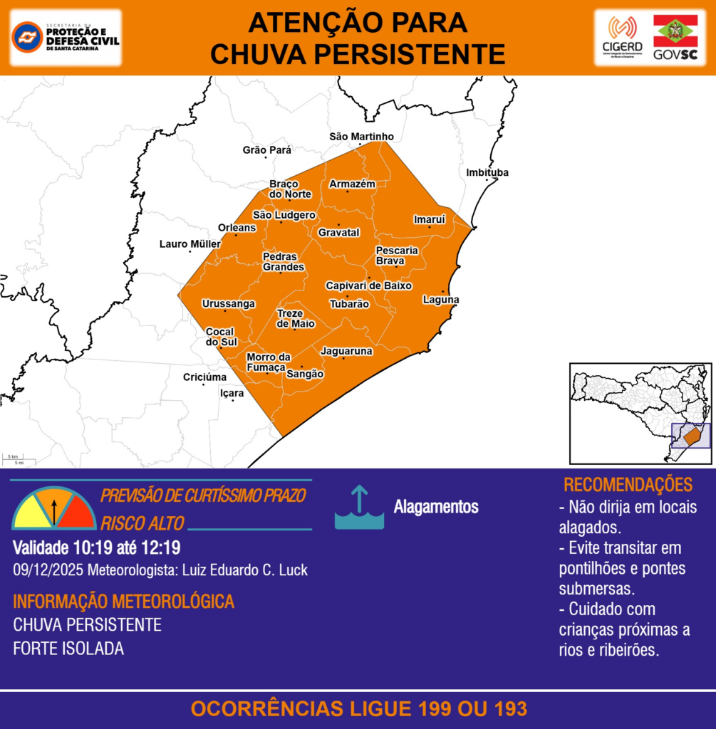 ATENÇÃO – 09/12 10:19 – CHUVA PERSISTENTE de intensidade forte isolada com ALAGAMENTOS para a região do Litoral Sul nas próximas 2 horas. Ocorrências ligue 199 ou 193.