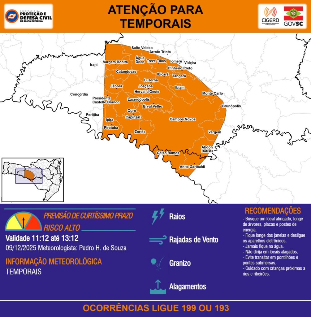 ATENÇÃO – 09/12 11:12 – TEMPORAIS com RAIOS, RAJADAS DE VENTO, GRANIZO e ALAGAMENTOS para as regiões do Meio-Oeste e Planalto Sul nas próximas 2 horas. Ocorrências ligue 199 ou 193.