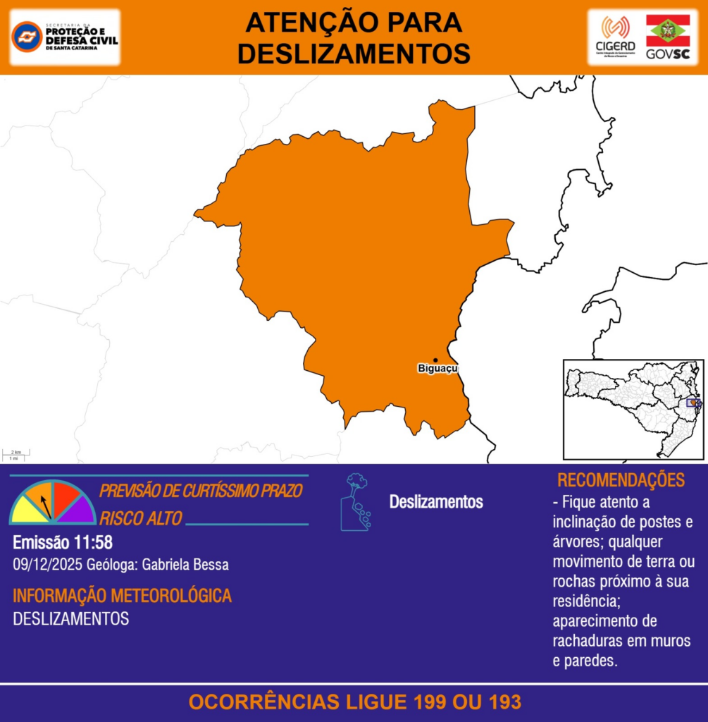 ATENÇÃO – 09/12 11:58 – DESLIZAMENTOS para o município de Biguaçu. Ocorrências ligue 199 ou 193.