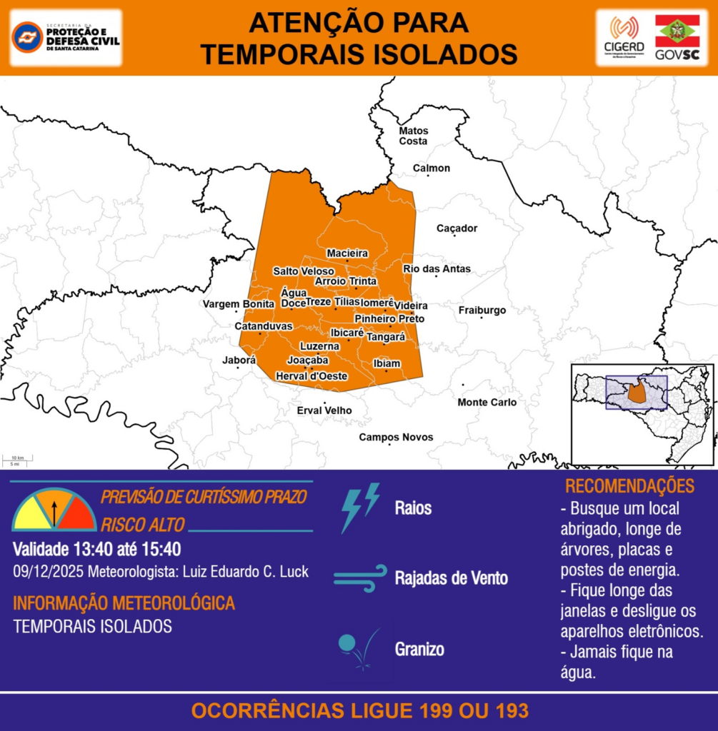 ATENÇÃO – 09/12 13:40 – TEMPORAIS ISOLADOS com RAIOS, RAJADAS DE VENTO e GRANIZO para a região do Meio-Oeste nas próximas 2 horas. Ocorrências ligue 199 ou 193.