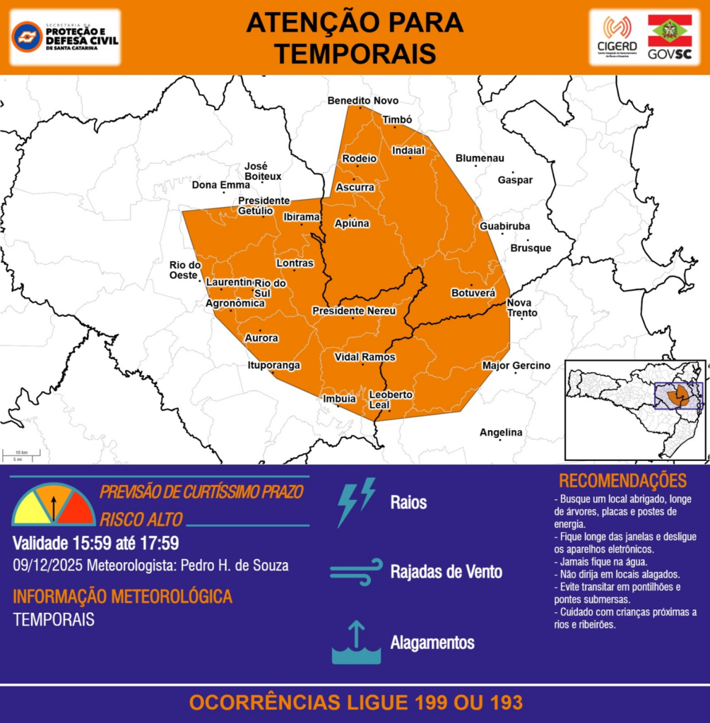 ATENÇÃO – 09/12 15:59 – TEMPORAIS com RAIOS, RAJADAS DE VENTO e ALAGAMENTOS para as regiões da Grande Florianópolis, Médio e Alto Vale do Itajaí nas próximas 2 horas. Ocorrências ligue 199 ou 193.