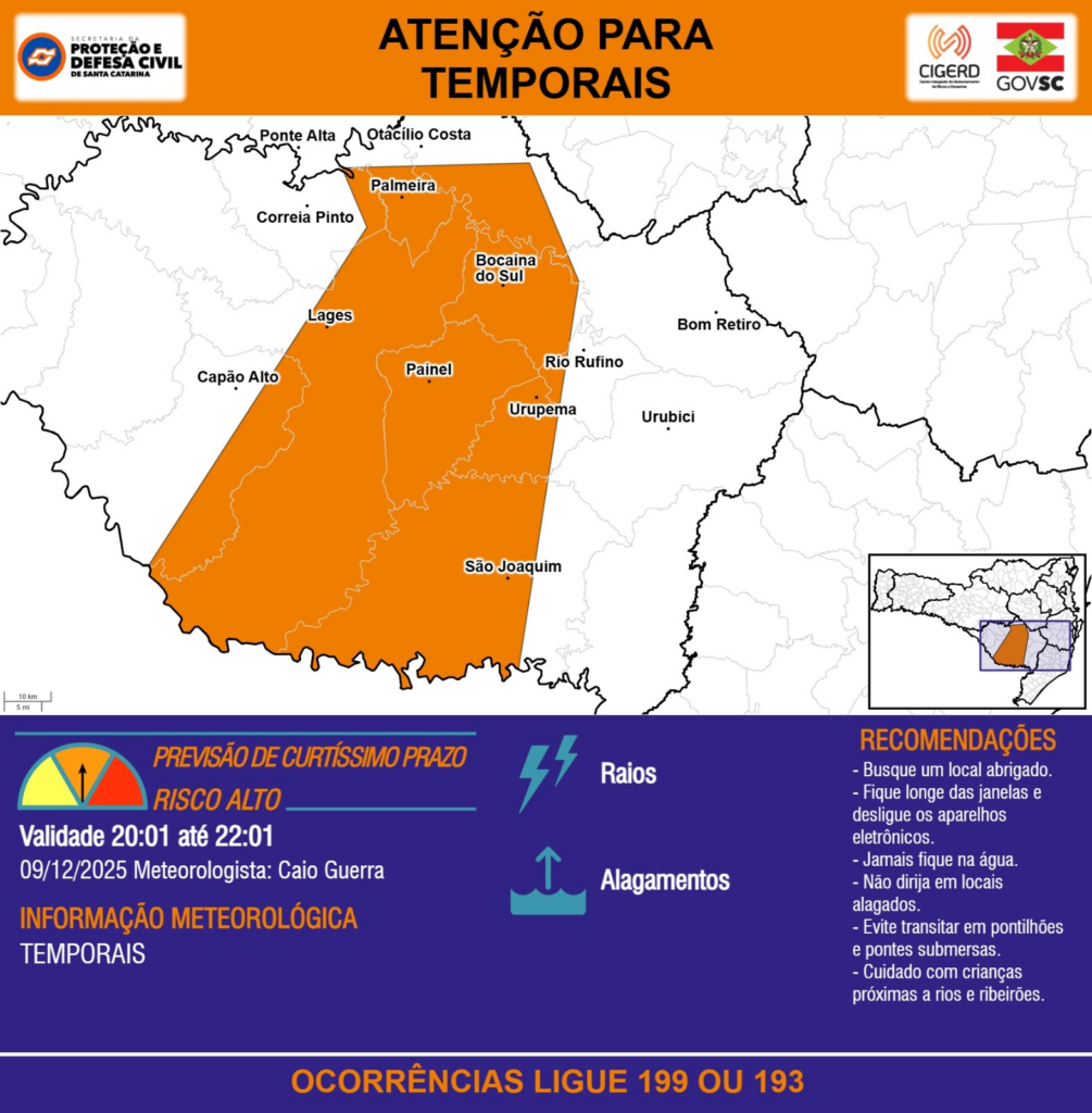 ATENÇÃO – 09/12 20:01 – TEMPORAIS com RAIOS e ALAGAMENTOS para as regiões do Meio-Oeste e Planalto Sul nas próximas 2 horas. Ocorrências ligue 199 ou 193.