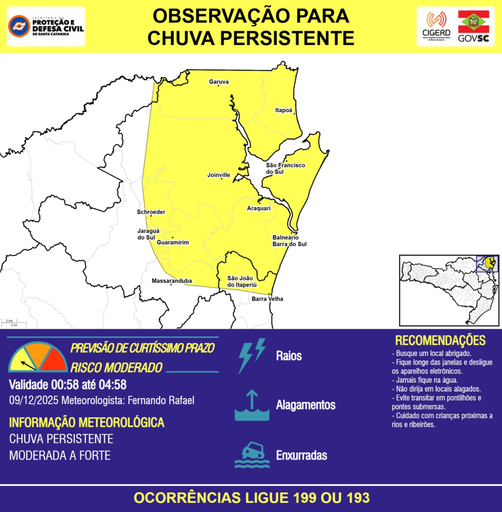 OBSERVAÇÃO – 09/12 00:58 – CHUVA PERSISTENTE de intensidade moderada a forte com RAIOS, ALAGAMENTOS pontuais e risco de ENXURRADAS para os municípios de Araquari, Balneário Barra do Sul, Barra Velha, Garuva, Guaramirim, Itapoá, Jaraguá do Sul, Joinville, Massaranduba, Schroeder, São Francisco do Sul e São João do Itaperiú nas próximas 4 horas. Ocorrências ligue 199 ou 193.