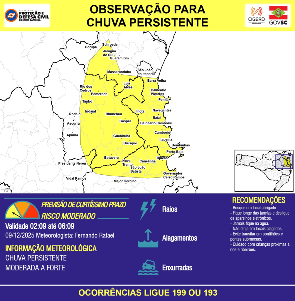 OBSERVAÇÃO – 09/12 02:09 – CHUVA PERSISTENTE de intensidade moderada a forte com RAIOS, ALAGAMENTOS pontuais e risco de ENXURRADAS para os municípios de Apiúna, Ascurra, Balneário Camboriú, Balneário Piçarras, Barra Velha, Biguaçu, Blumenau, Bombinhas, Botuverá, Brusque, Camboriú, Canelinha, Corupá, Gaspar, Governador Celso Ramos, Guabiruba, Guaramirim, Ilhota, Indaial, Itajaí, Itapema, Jaraguá do Sul, Luiz Alves, Major Gercino, Massaranduba, Navegantes, Nova Trento, Penha, Pomerode, Porto Belo, Presidente Nereu, Rio dos Cedros, Rodeio, Schroeder, São João Batista, São João do Itaperiú, Tijucas, Timbó e Vidal Ramos nas próximas 4 horas. Ocorrências ligue 199 ou 193.