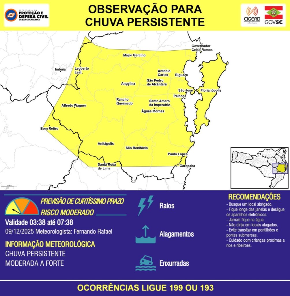 OBSERVAÇÃO – 09/12 03:38 – CHUVA PERSISTENTE de intensidade moderada a forte com RAIOS, ALAGAMENTOS pontuais e risco de ENXURRADAS para os municípios de Alfredo Wagner, Angelina, Anitápolis, Antônio Carlos, Biguaçu, Bom Retiro, Florianópolis, Garopaba, Governador Celso Ramos, Imbuia, Leoberto Leal, Major Gercino, Palhoça, Paulo Lopes, Rancho Queimado, Santa Rosa de Lima, Santo Amaro da Imperatriz, São Bonifácio, São José, São Pedro de Alcântara e Águas Mornas nas próximas 4 horas. Ocorrências ligue 199 ou 193.