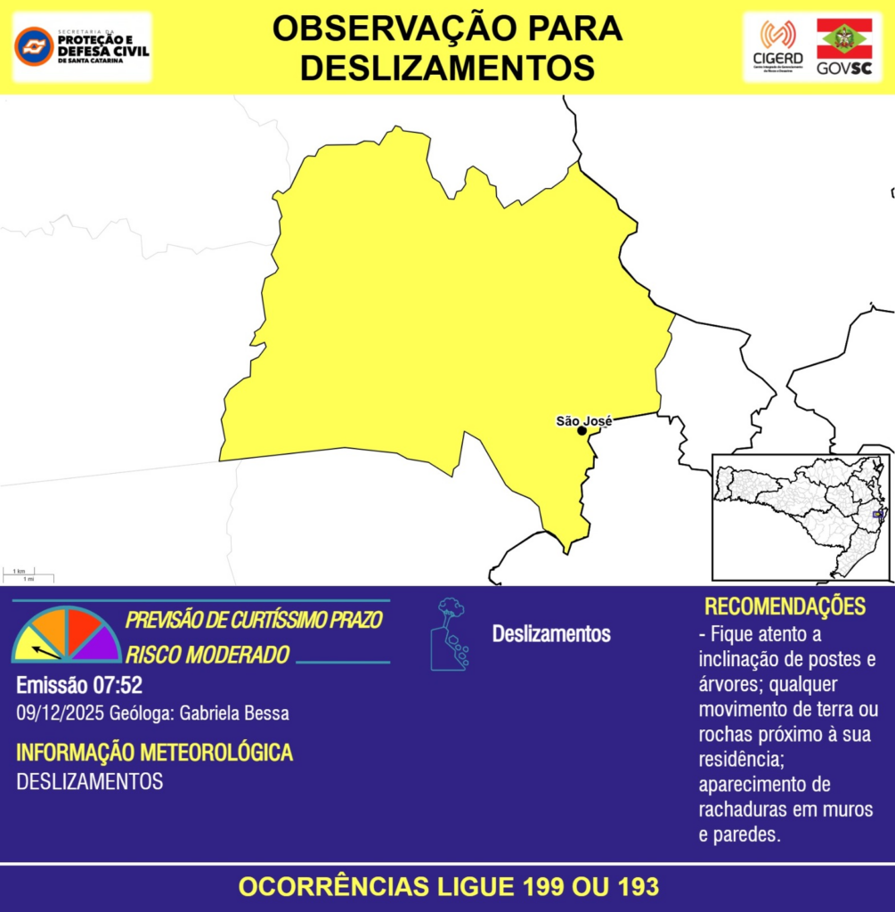OBSERVAÇÃO – 09/12 07:52 – DESLIZAMENTOS para o município de São José. Ocorrências ligue 199 ou 193.