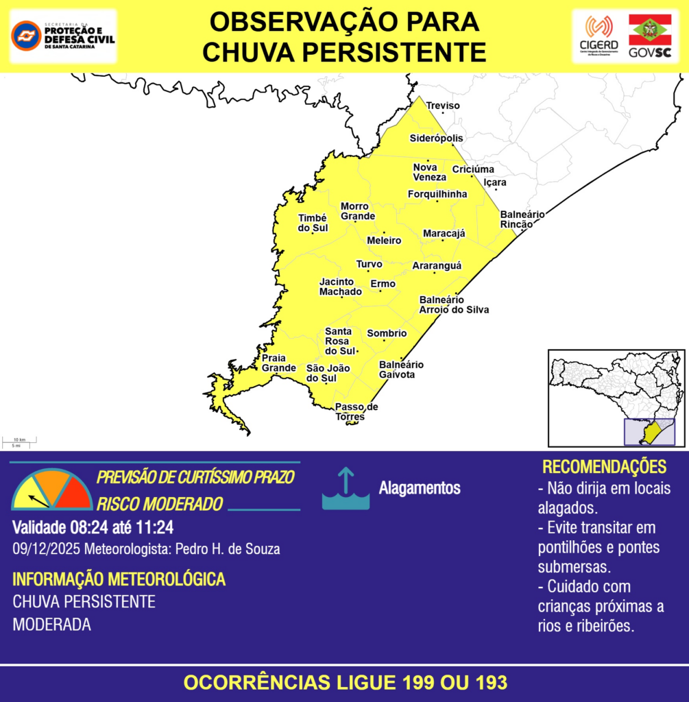 OBSERVAÇÃO – 09/12 08:24 – CHUVA PERSISTENTE de intensidade moderada com ALAGAMENTOS pontuais para a região do Litoral Sul nas próximas 3 horas. Ocorrências ligue 199 ou 193.