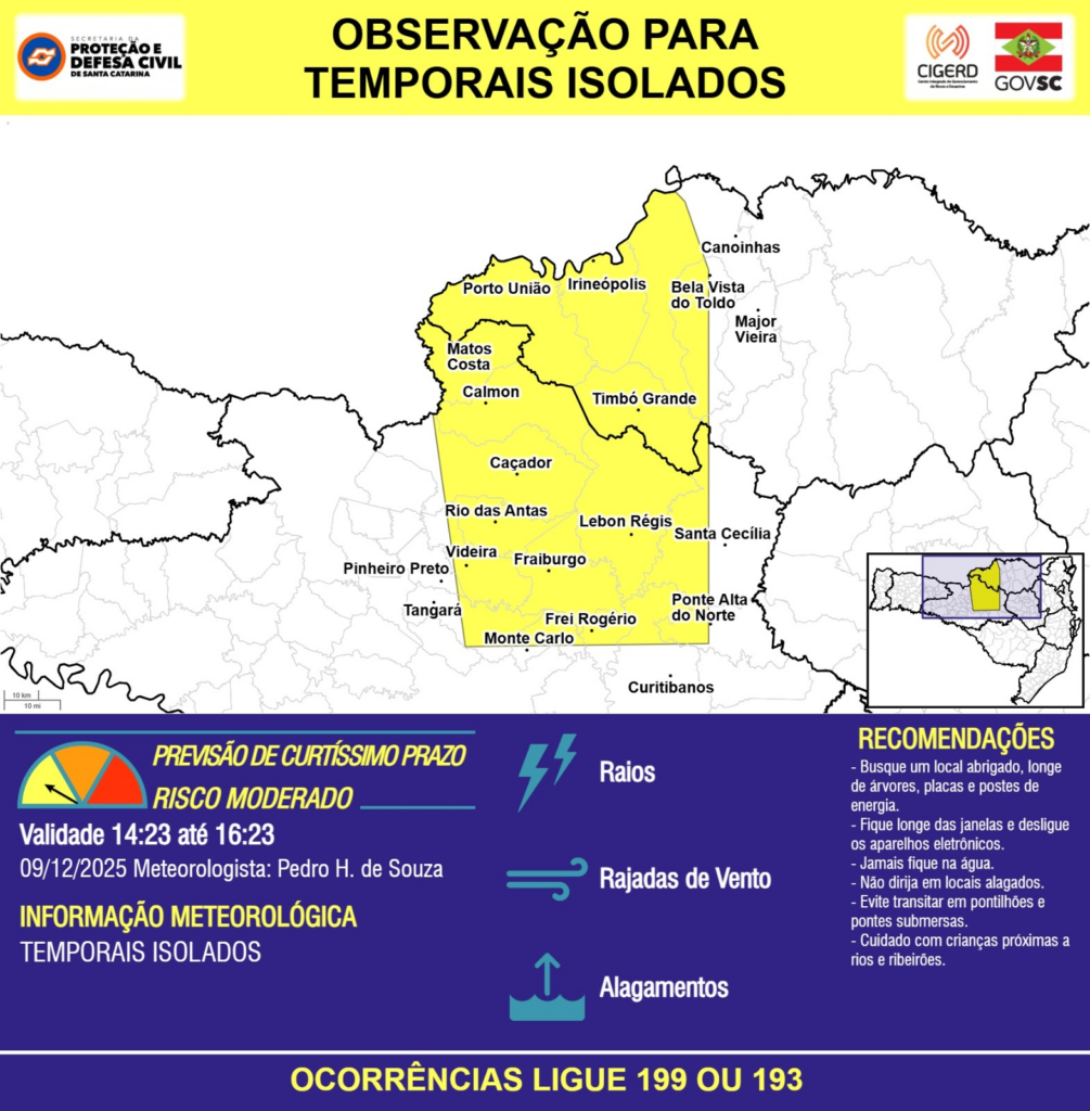 OBSERVAÇÃO – 09/12 14:23 – TEMPORAIS ISOLADOS com RAIOS, RAJADAS DE VENTO e ALAGAMENTOS pontuais para as regiões do Meio-Oeste e Planalto Norte nas próximas 2 horas. Ocorrências ligue 199 ou 193.