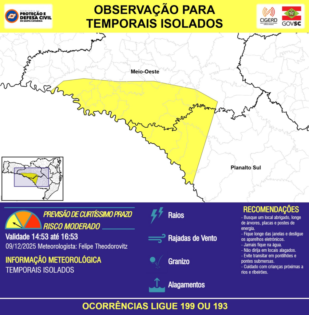 OBSERVAÇÃO – 09/12 14:53 – TEMPORAIS ISOLADOS com RAIOS, RAJADAS DE VENTO, GRANIZO e ALAGAMENTOS pontuais para as regiões do Meio-Oeste e Planalto Sul nas próximas 2 horas. Ocorrências ligue 199 ou 193.