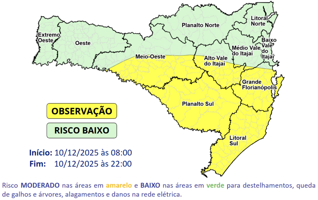 Nesta quarta-feira (10), os temporais retornam para SC, de forma isolada e atingindo principalmente as áreas mais próximas do RS. O ciclone extratropical, que causou chuva forte no estado na terça-feira (09), se posiciona sobre o mar na altura do Litoral do RS e além de causar ventos fortes, desloca umidade do mar para o continente que, combinada ao calor, favorece a ocorrência desses temporais. O risco é baixo a moderado para ocorrências associadas a destelhamentos, queda de galhos e árvores, alagamentos e danos na rede elétrica.