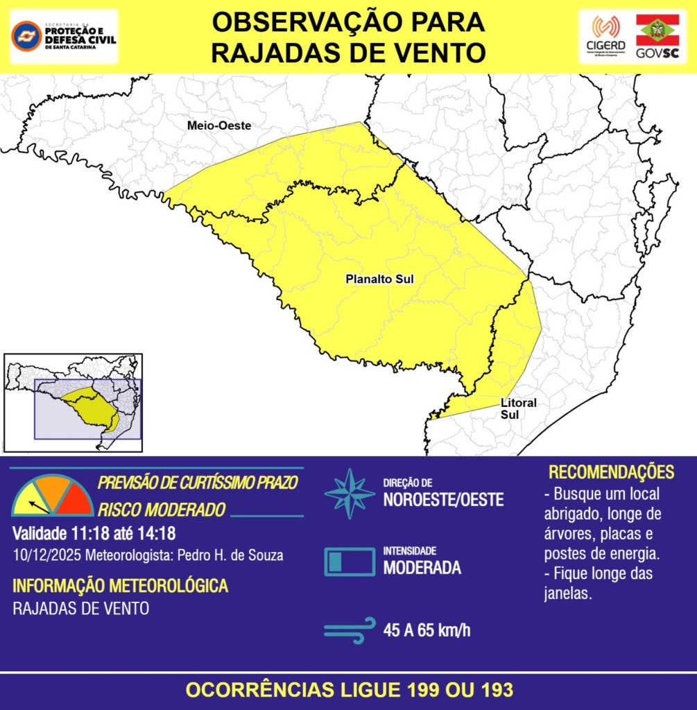 OBSERVAÇÃO – 10/12 11:18 – RAJADAS DE VENTO de quadrante noroeste/oeste, com intensidade MODERADA (45 a 65 km/h), para as regiões do Meio-Oeste, Planalto Sul e Litoral Sul nas próximas 3 horas. Ocorrências ligue 199 ou 193.