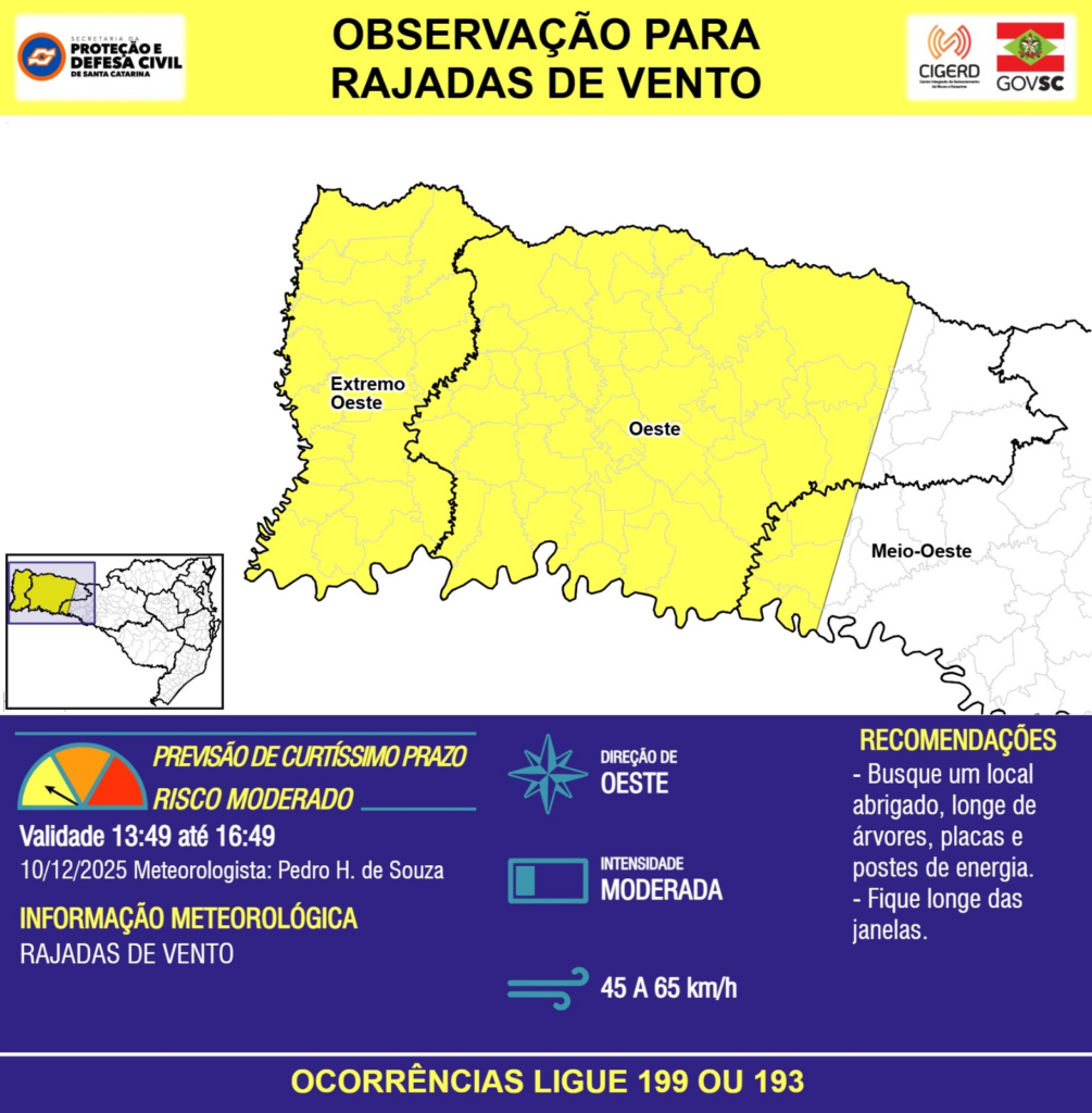 OBSERVAÇÃO – 10/12 13:49 – RAJADAS DE VENTO de quadrante oeste, com intensidade MODERADA (45 a 65 km/h), para as regiões do Extremo Oeste, Oeste e Meio-Oeste nas próximas 3 horas. Ocorrências ligue 199 ou 193.