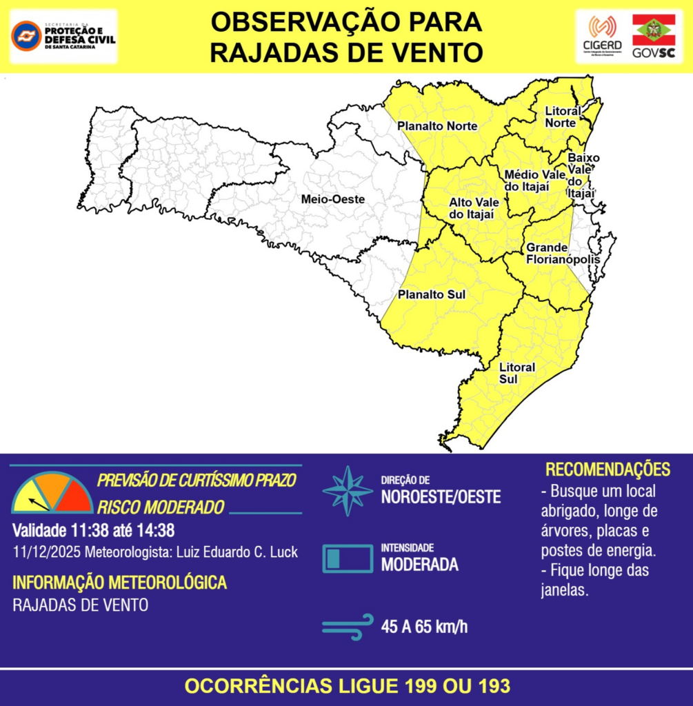 OBSERVAÇÃO – 11/12 11:38 – RAJADAS DE VENTO de quadrante noroeste/oeste, com intensidade MODERADA (45 a 65 km/h), para as regiões do Meio-Oeste, Planalto Norte, Litoral Norte, Planalto Sul, Litoral Sul, Grande Florianópolis, Baixo, Médio e Alto Vale do Itajaí nas próximas 3 horas. Ocorrências ligue 199 ou 193..