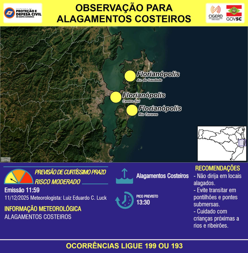 OBSERVAÇÃO – 11/12 11:59 – ALAGAMENTOS COSTEIROS nas próximas horas devido à maré alta para o município de Florianópolis. Pico previsto às 13:30 h. Ocorrências ligue 199 ou 193.