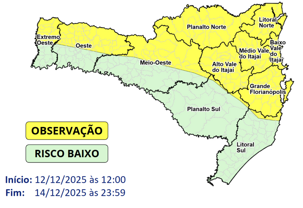 Na sexta-feira (12) os temporais começam pela região do Extremo Oeste entre fim da manhã e início da tarde, avançando gradativamente em direção às demais áreas ao longo do dia. São esperados temporais isolados no periódo da tarde no Planalto e Litoral Norte e Vale do Itajaí. Na Grande Florianópolis a chuva chega próxima a noite.