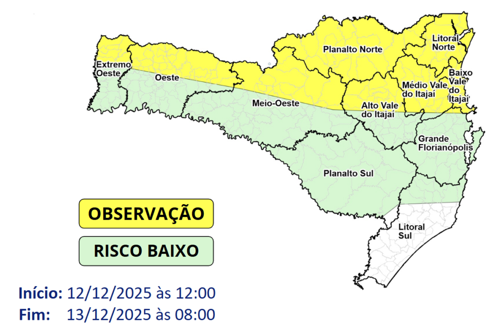 Entre o fim da manhã desta sexta-feira (12) e o início da manhã de sábado (13) volta a chover em Santa Catarina. A formação de um sistema de baixa pressão, deslocando-se para o oceano, em conjunto com o calor e umidade, favorece a formação de novas instabilidades, especialmente nas regiões de divisa com o PR, Vale do Itajaí e Litoral Norte. O risco é baixo a moderado para ocorrências associadas a alagamentos pontuais, destelhamentos, queda de galhos e árvores e danos na rede elétrica.