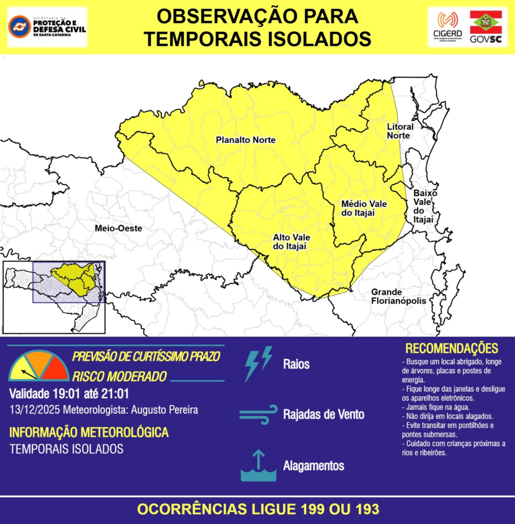 OBSERVAÇÃO – 13/12 19:01 – TEMPORAIS ISOLADOS com RAIOS, RAJADAS DE VENTO e ALAGAMENTOS pontuais para as regiões do Meio-Oeste, Planalto Norte, Litoral Norte, Planalto Sul, Grande Florianópolis, Baixo, Médio e Alto Vale do Itajaí nas próximas 2 horas. Ocorrências ligue 199 ou 193.