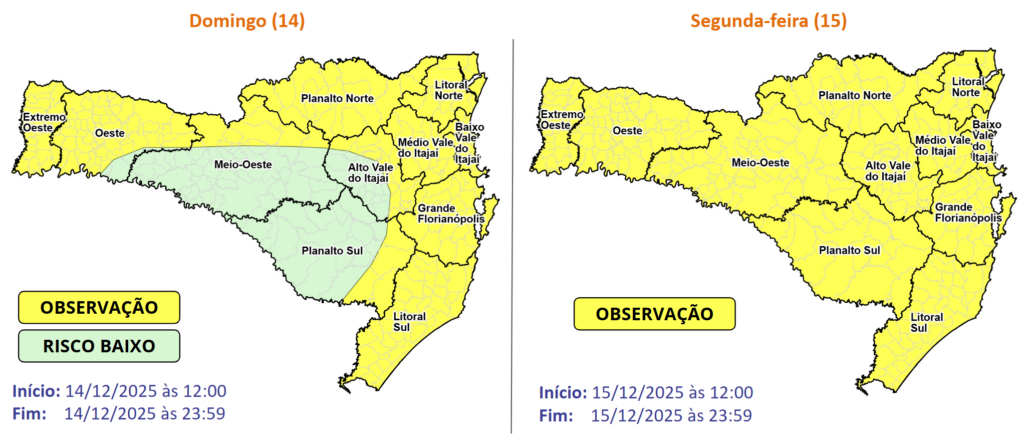 Entre as tardes e noites deste domingo (14) e da segunda-feira (15), o calor e a umidade, somados ao processo de formação de uma nova frente fria, favorecem o desenvolvimento de temporais em toda Santa Catarina. O risco é moderado a alto para ocorrências associadas a destelhamentos, quedas de galhos e árvores, danos na rede elétrica e alagamentos.