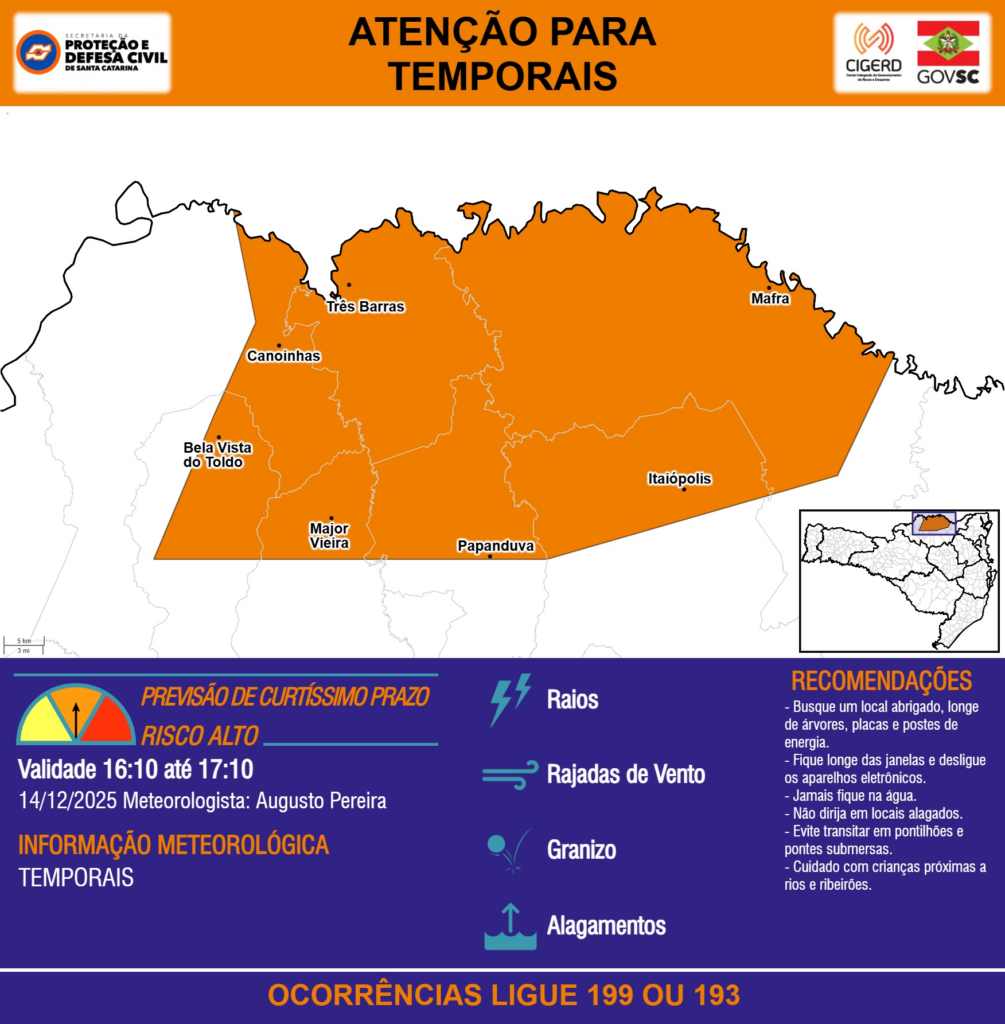 ATENÇÃO – 14/12 16:10 – TEMPORAIS com RAIOS, RAJADAS DE VENTO, GRANIZO e ALAGAMENTOS para os municípios de Bela Vista do Toldo, Canoinhas, Itaiópolis, Mafra, Major Vieira, Papanduva e Três Barras na próxima hora. Ocorrências ligue 199 ou 193.