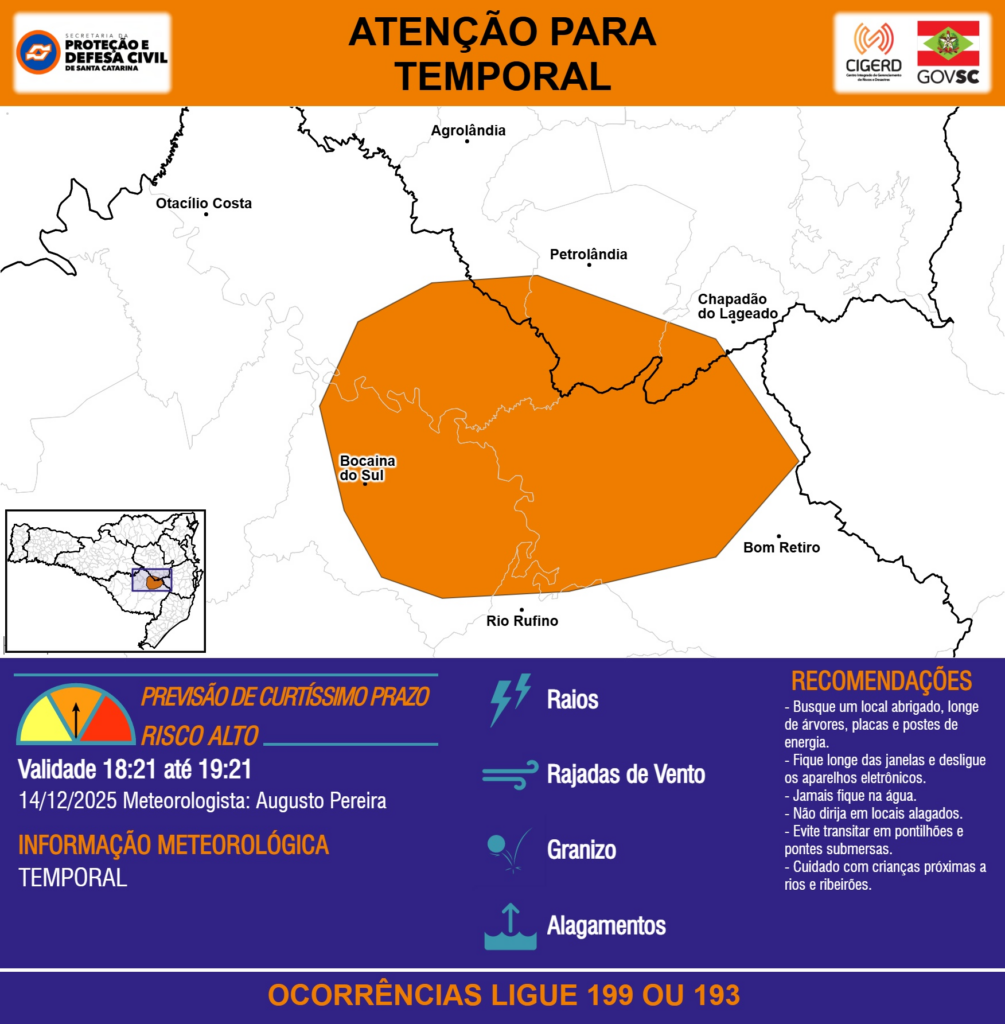 ATENÇÃO – 14/12 18:21 – TEMPORAL com RAIOS, RAJADAS DE VENTO, GRANIZO e ALAGAMENTOS para os municípios de Agrolândia, Bocaina do Sul, Bom Retiro, Chapadão do Lageado, Otacílio Costa, Petrolândia e Rio Rufino na próxima hora. Ocorrências ligue 199 ou 193.