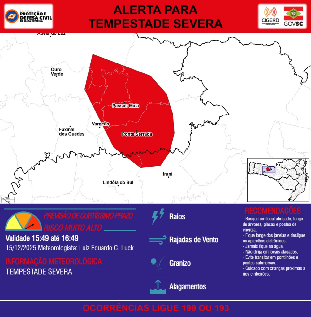 ALERTA – 15/12 15:49 – TEMPESTADE SEVERA com RAIOS, RAJADAS DE VENTO, GRANIZO e ALAGAMENTOS para os municípios de Passos Maia, Ponte Serrada na próxima hora. Ocorrências ligue 199 ou 193.
