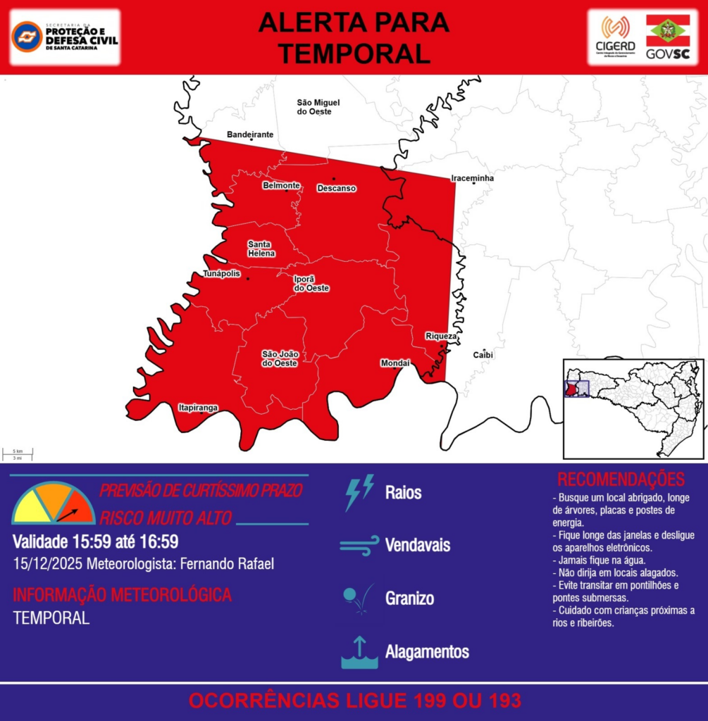 ALERTA – 15/12 15:49 – TEMPESTADE SEVERA com RAIOS, RAJADAS DE VENTO, GRANIZO e ALAGAMENTOS para os municípios de Passos Maia, Ponte Serrada na próxima hora. Ocorrências ligue 199 ou 193.