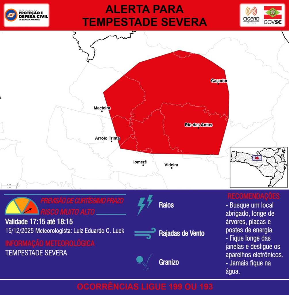 ALERTA – 15/12 17:15 – TEMPESTADE SEVERA com RAIOS, RAJADAS DE VENTO e GRANIZO para os municípios de Arroio Trinta, Calmon, Caçador, Iomerê, Macieira, Rio das Antas e Videira na próxima hora. Ocorrências ligue 199 ou 193.