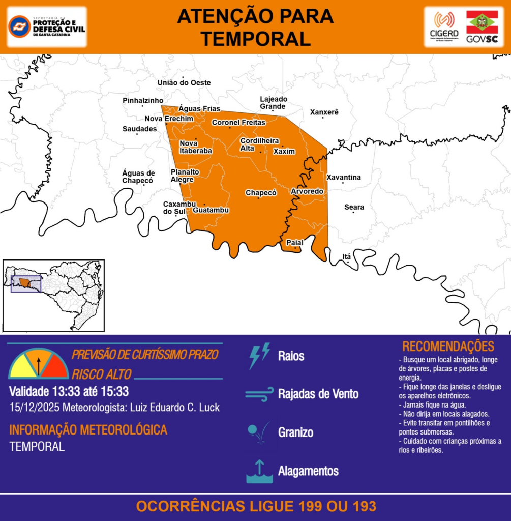 ATENÇÃO – 15/12 13:33 – TEMPORAL com RAIOS, RAJADAS DE VENTO, GRANIZO e ALAGAMENTOS para as regiões do Oeste e Meio-Oeste nas próximas 2 horas. Ocorrências ligue 199 ou 193.