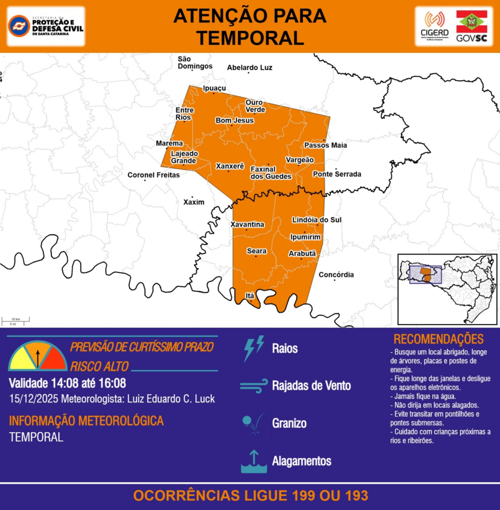 ATENÇÃO – 15/12 14:08 – TEMPORAL com RAIOS, RAJADAS DE VENTO, GRANIZO e ALAGAMENTOS para as regiões do Oeste e Meio-Oeste nas próximas 2 horas. Ocorrências ligue 199 ou 193.