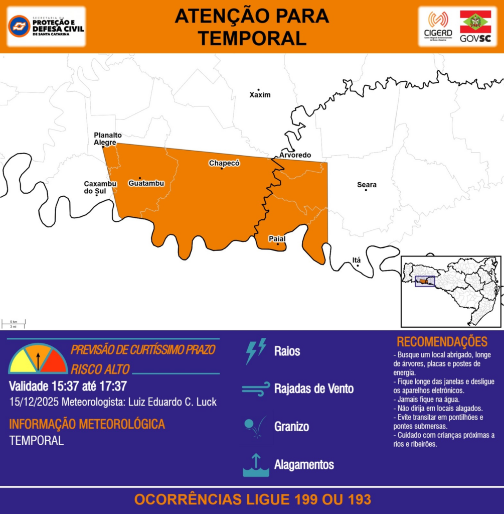 ATENÇÃO – 15/12 15:37 – TEMPORAL com RAIOS, RAJADAS DE VENTO, GRANIZO e ALAGAMENTOS para as regiões do Oeste e Meio-Oeste nas próximas 2 horas. Ocorrências ligue 199 ou 193.