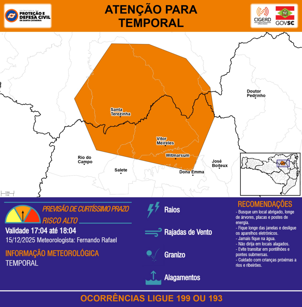 ATENÇÃO – 15/12 17:04 – TEMPORAL com RAIOS, RAJADAS DE VENTO, GRANIZO e ALAGAMENTOS para os municípios de Dona Emma, Doutor Pedrinho, Itaiópolis, José Boiteux, Papanduva, Rio Negrinho, Rio do Campo, Salete, Santa Terezinha, Vitor Meireles e Witmarsum na próxima hora. Ocorrências ligue 199 ou 193.