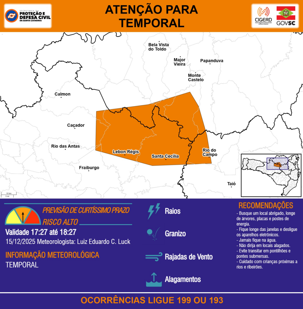 ATENÇÃO – 15/12 17:27 – TEMPORAL com RAIOS, GRANIZO, RAJADAS DE VENTO e ALAGAMENTOS para os municípios de Bela Vista do Toldo, Calmon, Caçador, Fraiburgo, Lebon Régis, Major Vieira, Monte Castelo, Papanduva, Rio das Antas, Rio do Campo, Santa Cecília e Taió na próxima hora. Ocorrências ligue 199 ou 193.
