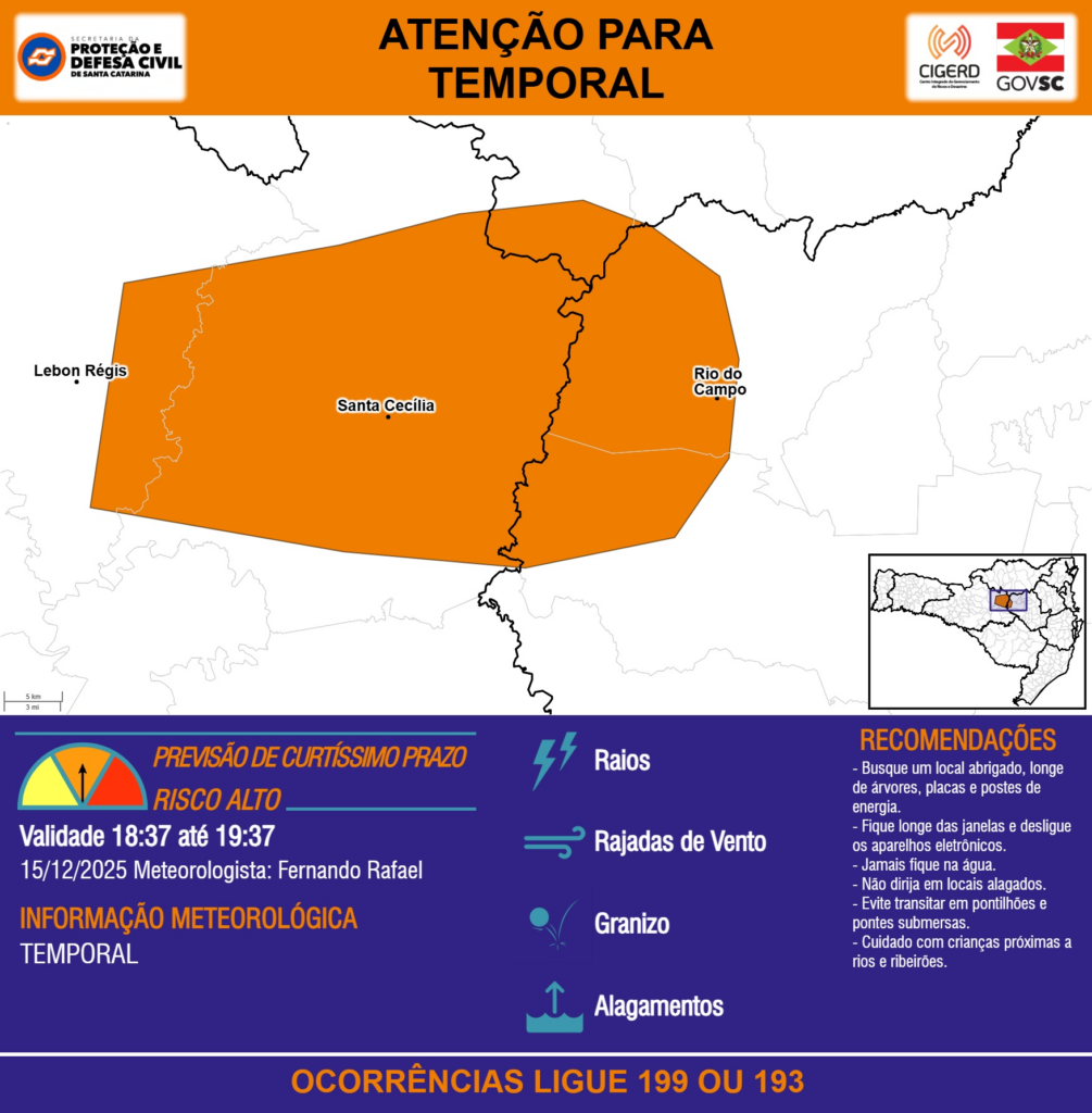 ATENÇÃO – 15/12 18:37 – TEMPORAL com RAIOS, RAJADAS DE VENTO, GRANIZO e ALAGAMENTOS para os municípios de Lebon Régis, Monte Castelo, Papanduva, Rio do Campo, Santa Cecília e Taió na próxima hora. Ocorrências ligue 199 ou 193.