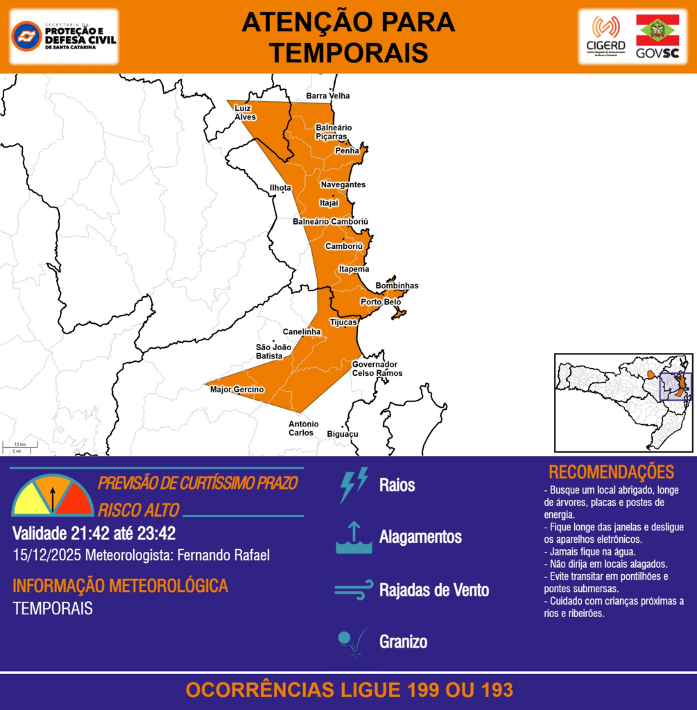 ATENÇÃO – 15/12 21:42 – TEMPORAIS com RAIOS, ALAGAMENTOS, RAJADAS DE VENTO e GRANIZO para os municípios de Antônio Carlos, Balneário Camboriú, Balneário Piçarras, Barra Velha, Biguaçu, Bombinhas, Camboriú, Canelinha, Governador Celso Ramos, Ilhota, Itajaí, Itapema, Luiz Alves, Major Gercino, Navegantes, Penha, Porto Belo, Santa Terezinha, São João Batista e Tijucas nas próximas 2 horas. Ocorrências ligue 199 ou 193.