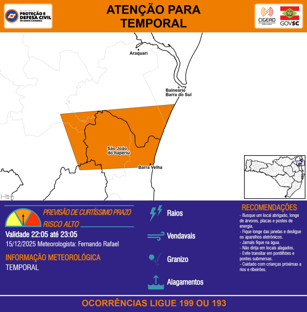 ATENÇÃO – 15/12 22:05 – TEMPORAL com RAIOS, VENDAVAIS, GRANIZO e ALAGAMENTOS para os municípios de Araquari, Balneário Barra do Sul, Barra Velha, Luiz Alves e São João do Itaperiú na próxima hora. Ocorrências ligue 199 ou 193.