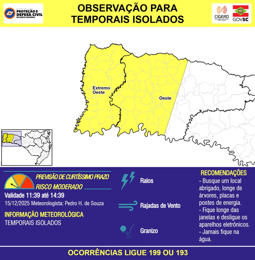 OBSERVAÇÃO – 15/12 11:39 – TEMPORAIS ISOLADOS com RAIOS, RAJADAS DE VENTO e GRANIZO para as regiões do Extremo Oeste e Oeste nas próximas 3 horas. Ocorrências ligue 199 ou 193.