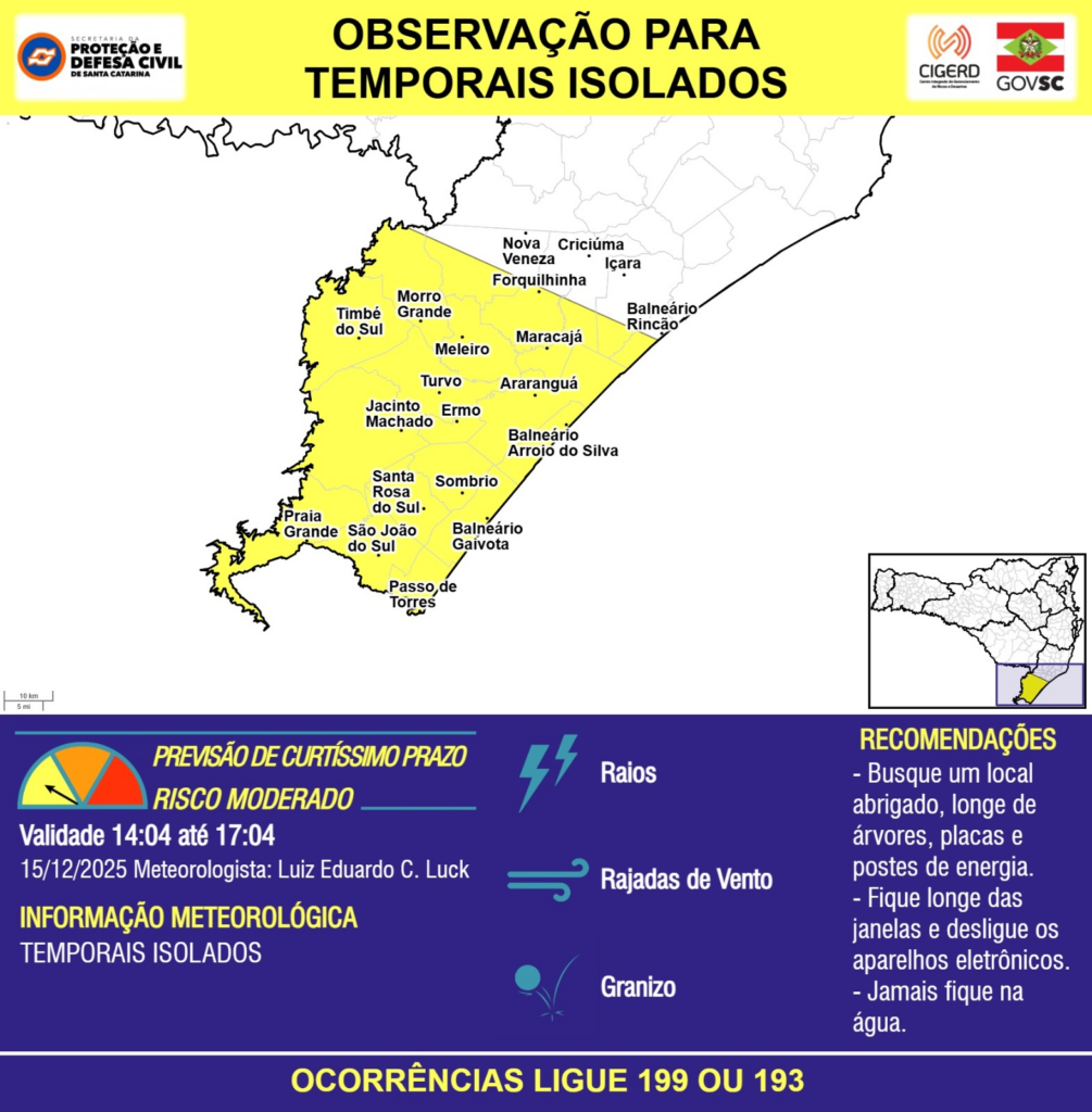 OBSERVAÇÃO – 15/12 14:04 – TEMPORAIS ISOLADOS com RAIOS, RAJADAS DE VENTO e GRANIZO para a região do Litoral Sul nas próximas 3 horas. Ocorrências ligue 199 ou 193.