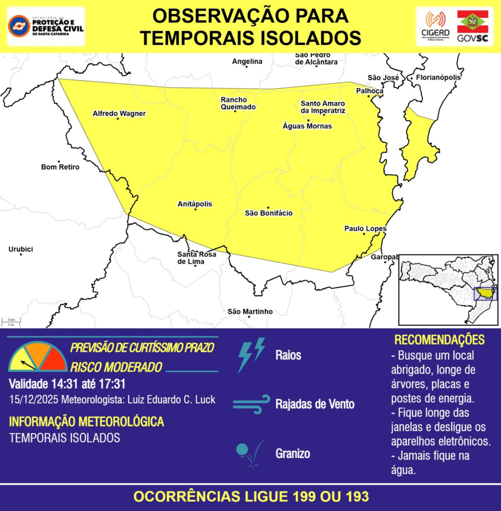 OBSERVAÇÃO – 15/12 14:31 – TEMPORAIS ISOLADOS com RAIOS, RAJADAS DE VENTO e GRANIZO para as regiões do Planalto Sul, Litoral Sul e Grande Florianópolis nas próximas 3 horas. Ocorrências ligue 199 ou 193.