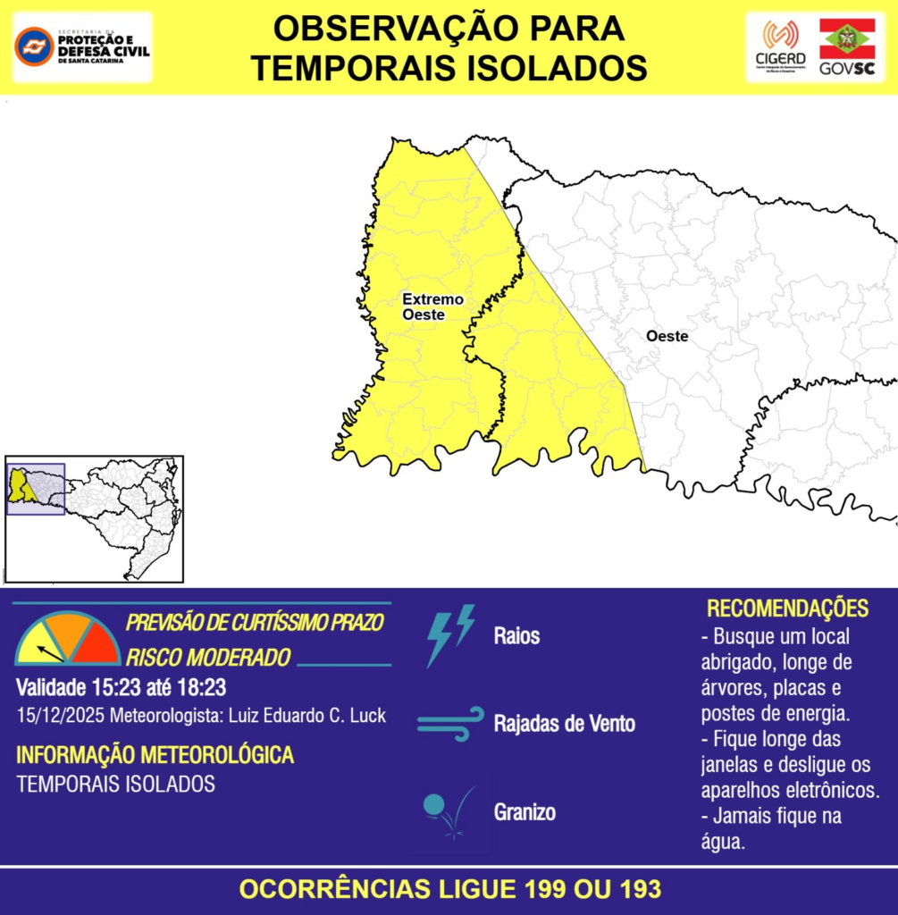 OBSERVAÇÃO – 15/12 15:23 – TEMPORAIS ISOLADOS com RAIOS, RAJADAS DE VENTO e GRANIZO para as regiões do Extremo Oeste e Oeste nas próximas 3 horas. Ocorrências ligue 199 ou 193.
