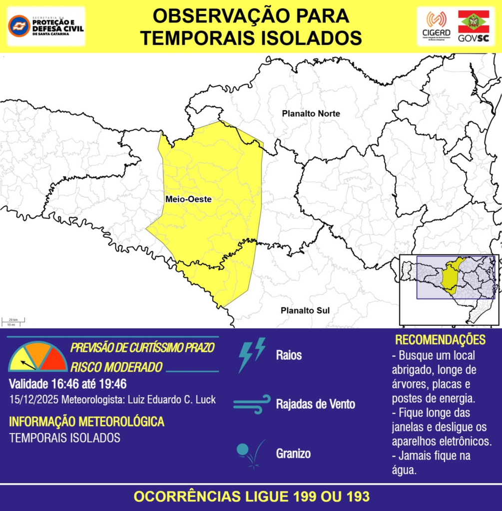 OBSERVAÇÃO – 15/12 16:46 – TEMPORAIS ISOLADOS com RAIOS, RAJADAS DE VENTO e GRANIZO para as regiões do Meio-Oeste, Planalto Norte e Planalto Sul nas próximas 3 horas. Ocorrências ligue 199 ou 193.