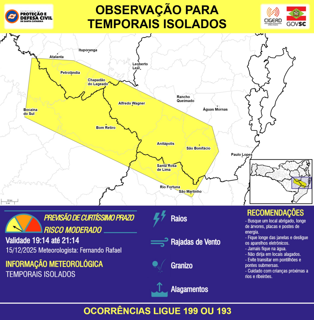 OBSERVAÇÃO – 15/12 19:14 – TEMPORAIS ISOLADOS com RAIOS, RAJADAS DE VENTO, GRANIZO e ALAGAMENTOS pontuais para os municípios de Alfredo Wagner, Anitápolis, Atalanta, Bocaina do Sul, Bom Retiro, Chapadão do Lageado, Ituporanga, Leoberto Leal, Paulo Lopes, Petrolândia, Rancho Queimado, Rio Fortuna, Santa Rosa de Lima, São Bonifácio, São Martinho e Águas Mornas nas próximas 2 horas. Ocorrências ligue 199 ou 193.