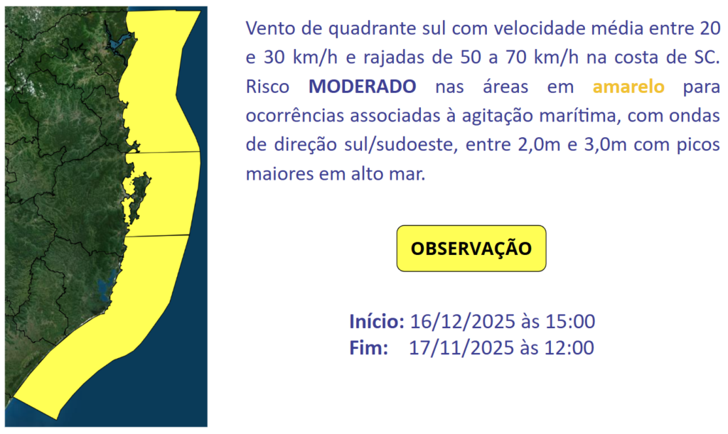 Entre a tarde desta terça (16) e a manhã de quarta-feira (17), a intensificação dso ventos de quadrante sul, na costa, devido ao avanço de uma frente fria, favorece a agitação marítima em todo o Litoral de Santa Catarina, com ondas de sul/sudoeste entre 2,0m e 3,0m e picos maiores em alto mar. O risco é MODERADO para ocorrências associadas à agitação marítima.