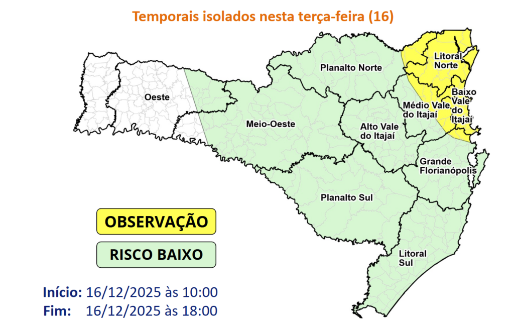 A partir da manhã, temporais isolados e de menor intensidade iniciam-se no Oeste e avançam em direção às regiões dos Planaltos, Alto e Médio Vale do Itajaí, Grande Florianópolis e Litoral Sul. No início da tarde, essas instabilidades tendem a ganhar intensidade, sendo acompanhadas por raios, rajadas de vento, chuva pontualmente intensa e eventual queda de granizo entre o Litoral Norte Baixo Vale do Itajaí e partes do Médio Vale do Itajaí.