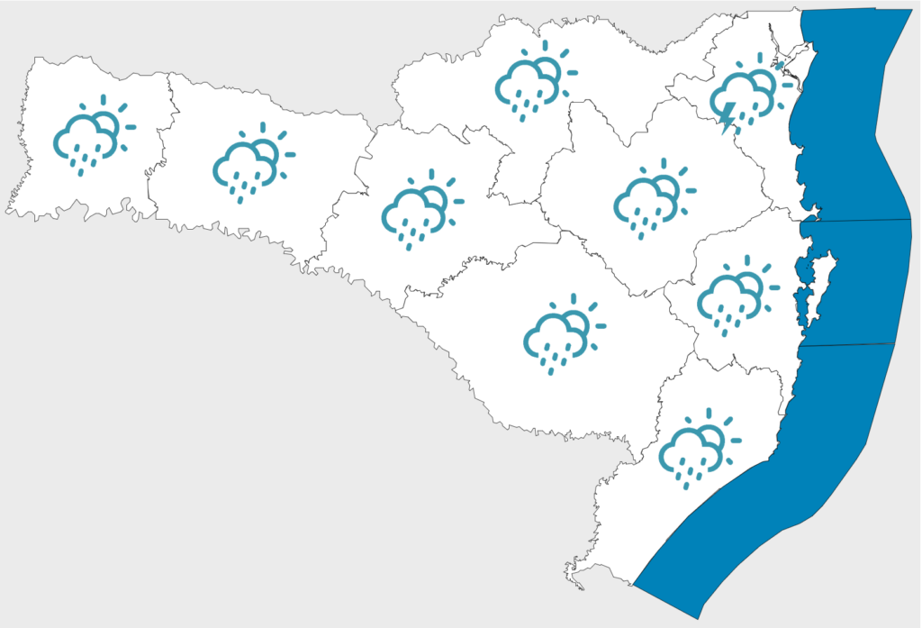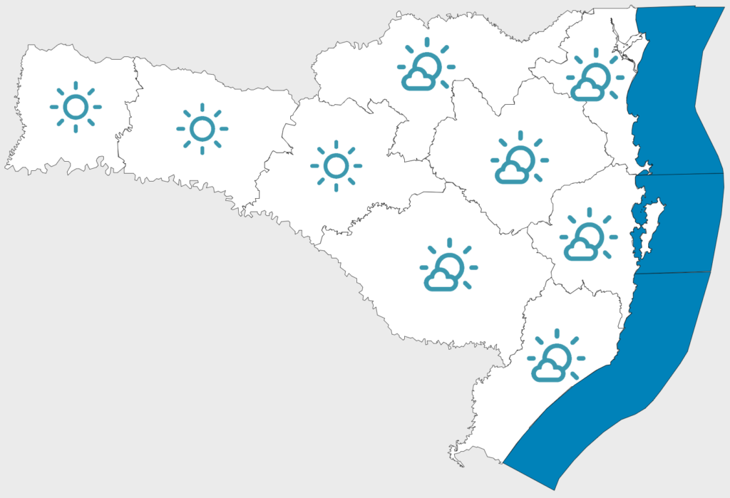 A quarta-feira (17) começa com muitas nuvens e formação de nevoeiros, sobretudo entre os planaltos e o Litoral, resultado do resfriamento provocado pela chegada da massa de ar seco e frio. Mas no decorrer da manhã a nebulosidade diminui e o sol passa a predominar em todo o estado. No amanhecer, temperaturas baixas com mínimas entre 5 e 10°C nos planaltos e Grande Florianópolis Serrana, ficando ainda mais baixas na Serra. Nas demais regiões, mínimas entre 12 e 15°C. À tarde esquenta e as máximas voltam a se aproximar dos 30°C no Grande Oeste e a variar entre 24 e 26°C nas demais regiões. A agitação marítima diminui no decorrer do dia, mas ainda pela manhã as ondas de sul/sudeste variam de 2.0 a 2.5m. Risco baixo a moderado para ocorrências relacionadas à agitação marítima.