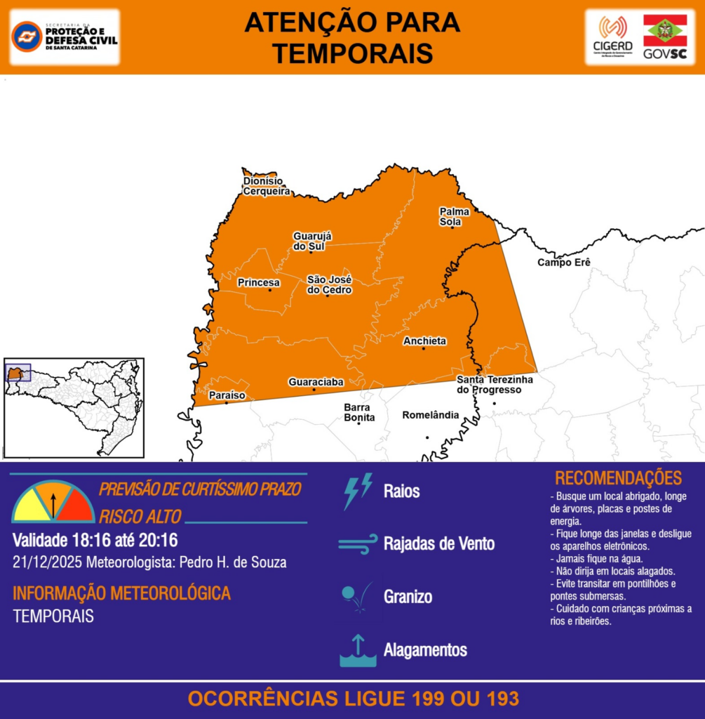 ATENÇÃO – 21/12 18:16 – TEMPORAIS com RAIOS, RAJADAS DE VENTO, GRANIZO e ALAGAMENTOS para as regiões do Extremo Oeste e Oeste nas próximas 2 horas. Ocorrências ligue 199 ou 193.